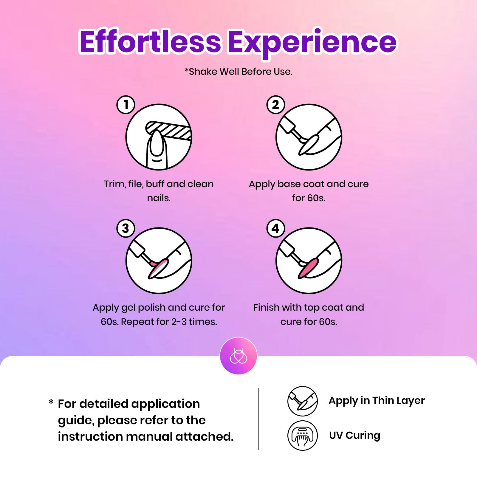 - Apply color gel and cure for 60s-90s (repeat 2-3times)