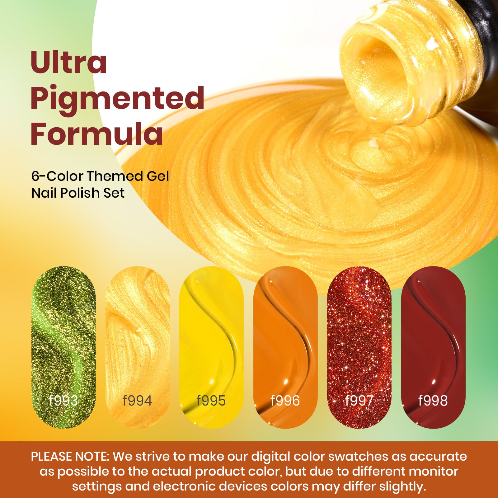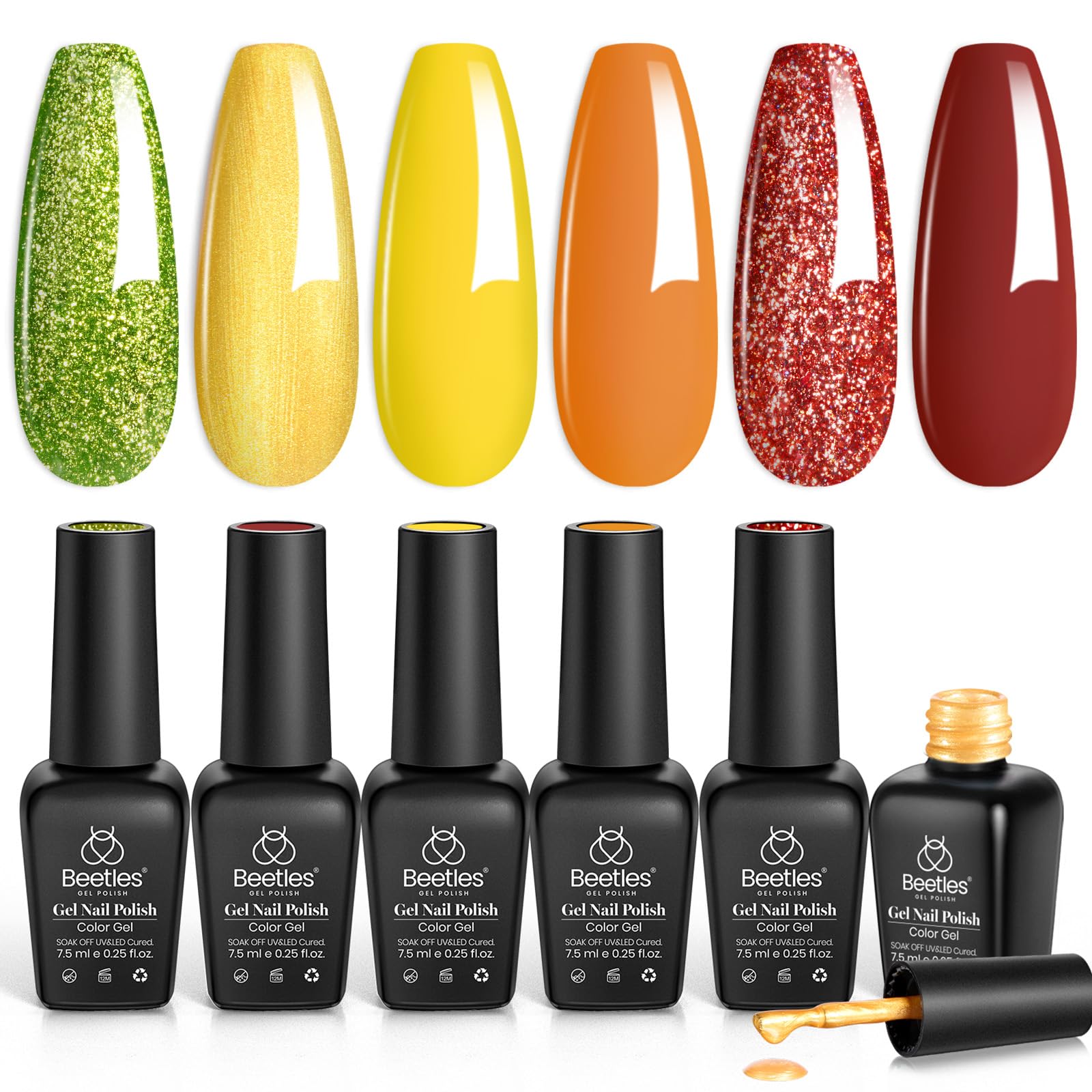 【Beetles Twilight Warmth Collection 】: Beetles yellow orange burgundy red green gel polish golden glitter nails kit which are Inspired by the sky at twilight, this gradient flows from bright yellow to deep red, telling a warm story of sunset and the approaching night..