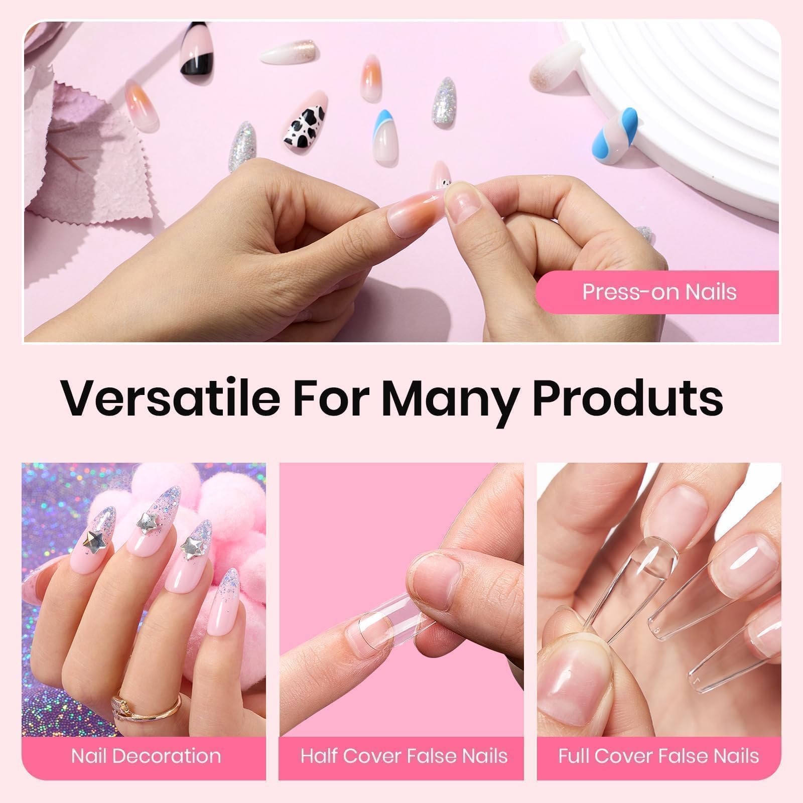 - Nail Glue:Apply thin layer onto natural nail. Cure for 60-90s.