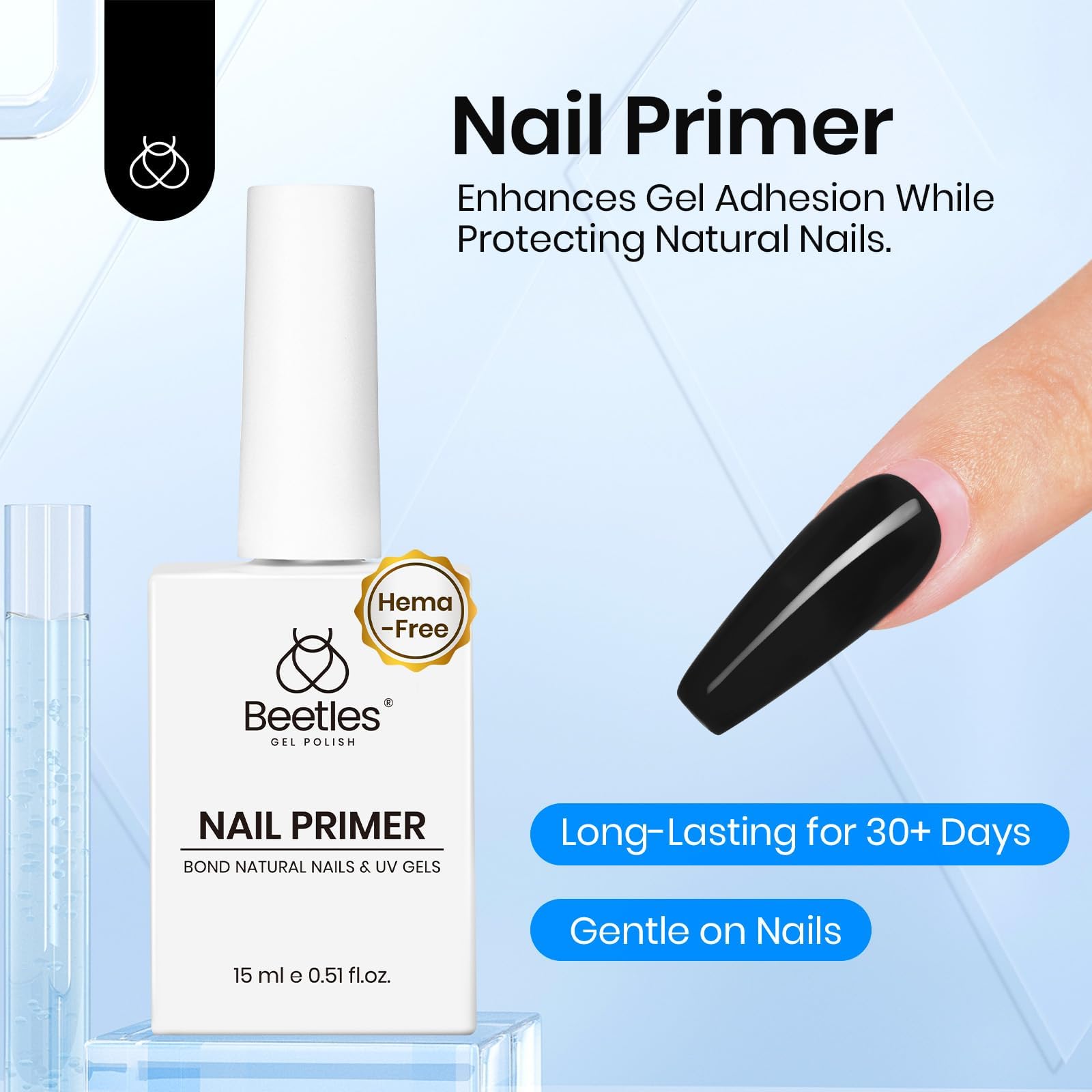 4.Top Coat Apply a thin layer, clean up any excess, and seal the edges. Cure for 60-120s under Beetles UV lamp.*Notice: Curing time varies depending on the wattage of the lamp. May produce an allergic reaction by skin contact.