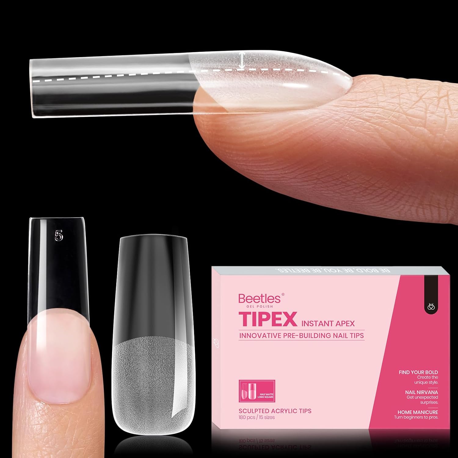 - Beetles Tipex Nail Tips Upgraded: Tired of wasting time on nail prep? Tipex pre-sculpted, pre-etched & pre-shaped acrylic nail tips are here to rescue you! Beetles Tipex Instant Apex Nail Tips come with a ready-made instant apex and c-curve, eliminating the tedious tasks of layering, filing, and shaping. Get ready to speed up your mani process with nail drill and save valuable time! Designed specifically for flat nails.