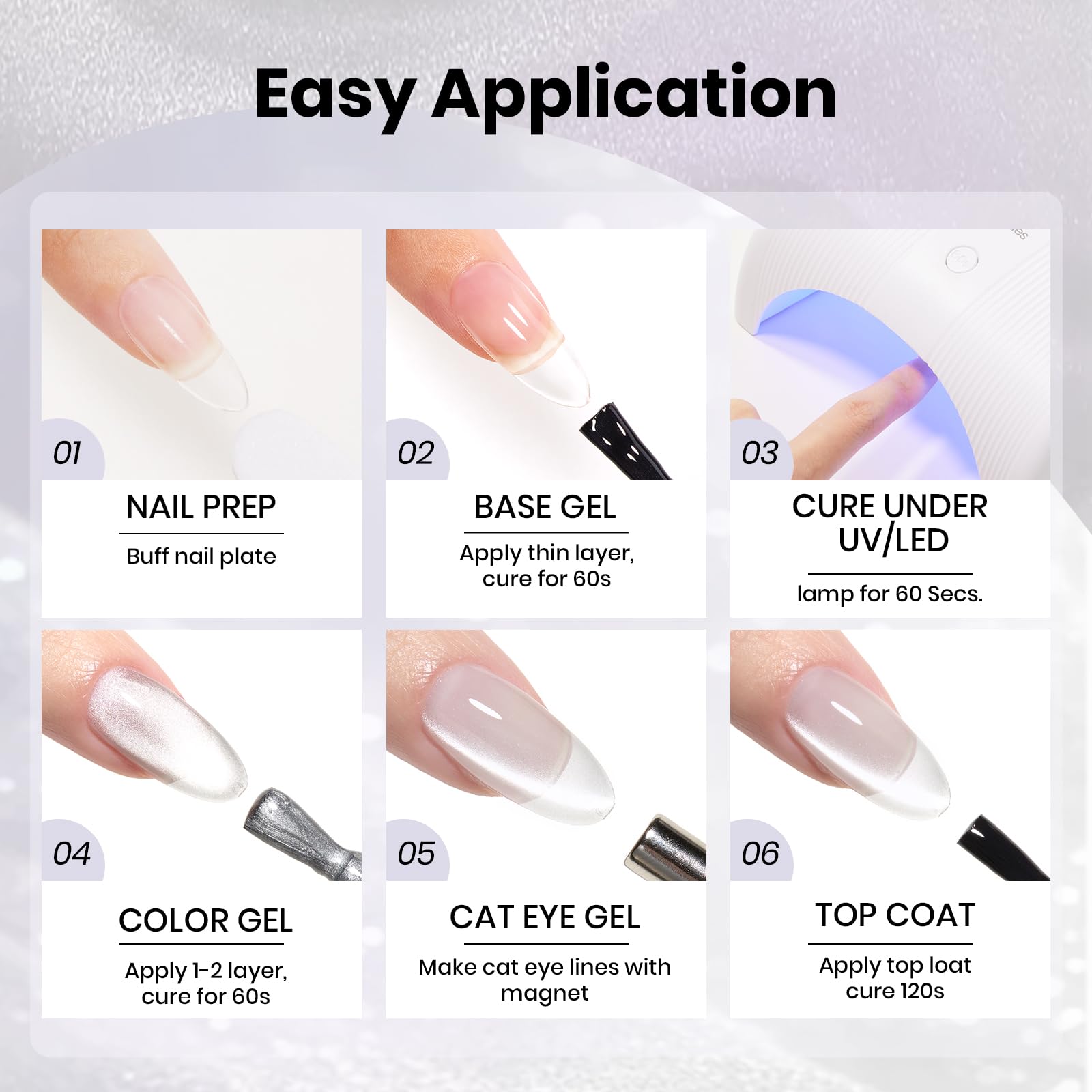 - 【Speed Curing with Uv/Led Lamp】The silver cat eye gel polish needs to be cured under the uv/led light. The average time for uv/led lights is 60-120 secs. It remains sticky after curing and must be used with a base coat and top coat! (Note:This item does not include a base&top coat, which needs to be purchased separately)