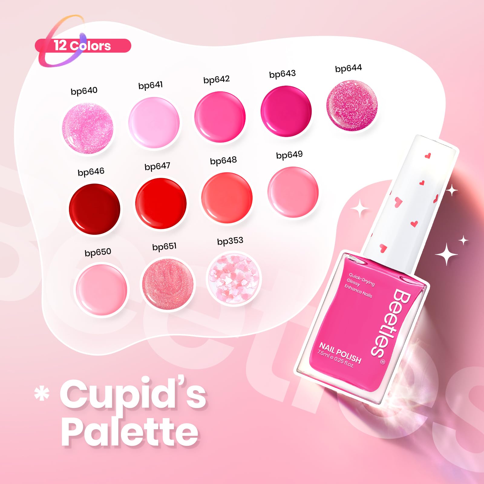 - Valentine Nail Polish Set: Beetles Pink Nail Polish Quick Dry Set Valentine's Day Limited Edition - Love's Prism! You will receive quick dry nail polish set in 12colors, as well as glitter nail polish set in pink, red series. Unique red love sequin nail polish is a romantic 3D love sequin, hides the Love of Valentine's Day in your fingertips, and ensures that you have romantic Valentine's Day nails in different scenes.