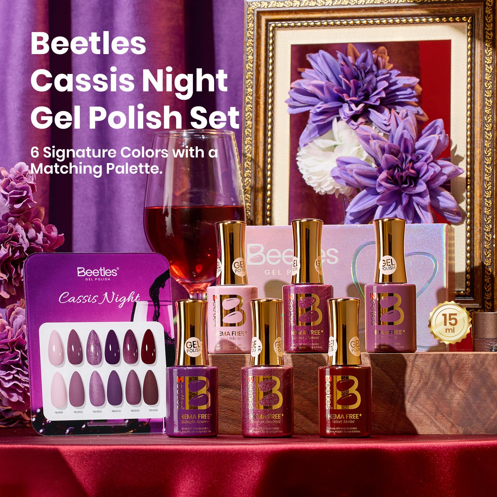 Beetles Purple Gel Polish Set - Cassis Night Collection HEMA-Free - 6 Colors 15ml Dark Purple Glitter Shimmer Color Nails