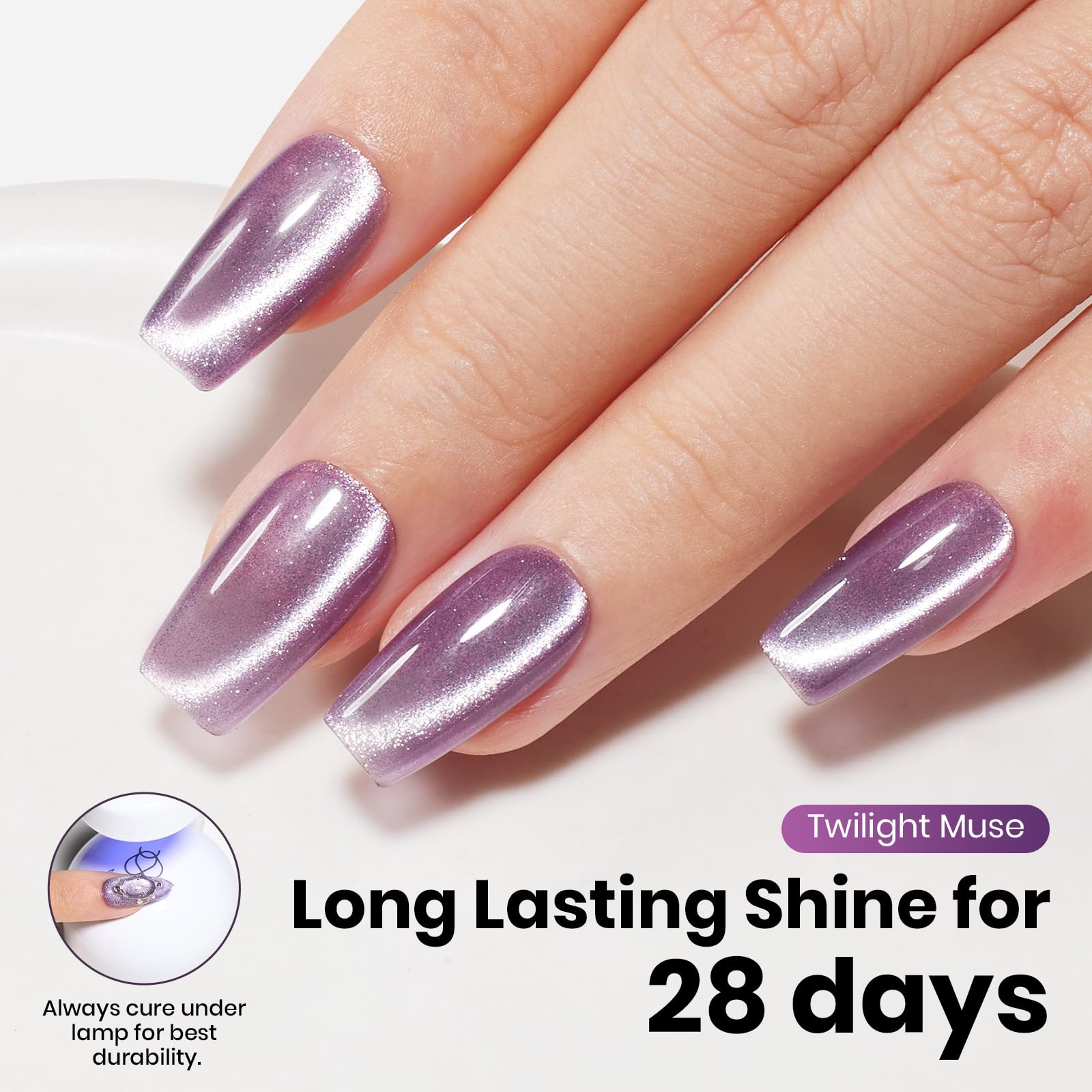 - 【28 Days Long Lasting】Beetles purple cat eye gel polish lasts for 28+ days with high gloss shine under proper application. Strong, long-lasting, and flexible with excellent adhesion and flawless results without the need for professional help(Tips: Place the magnetic stick over the surface about 3-5mm for 5-10 seconds to get your desired effect)
