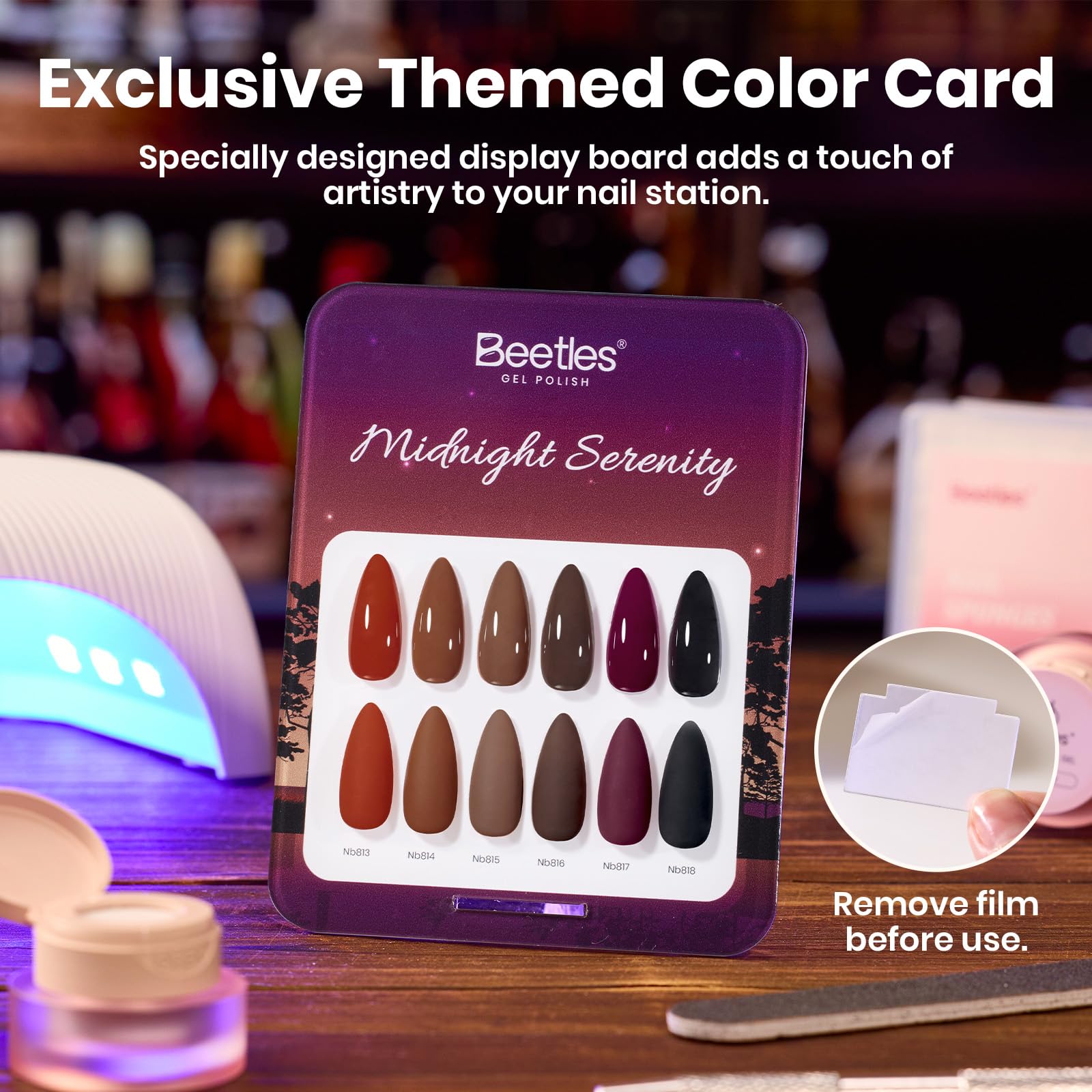 Beetles Midnight Serenity Gel Polish Set Inspired Shades:Inspired by the quiet charm of a midnight café—warm lights, mocha air, leather textures, and deep alluring tones. This 6-color gel polish set captures a cool-yet-cozy aesthetic with rich mocha brown, berry wine, espresso plum, and muted noir hues that glow beautifully under low light. Perfect for fall, winter, and anyone who loves dark feminine elegance.