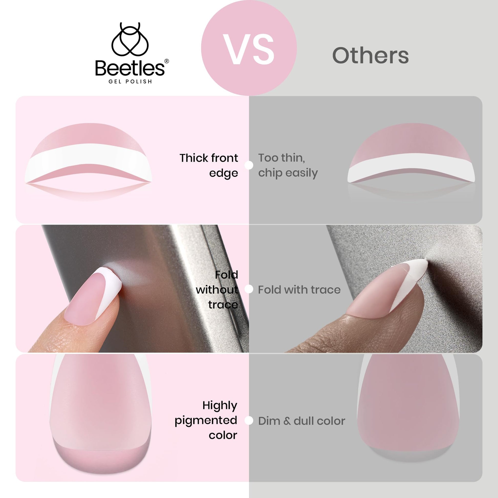 - Beetle Soft Gel: French tip press on nails short are made of Beetles proprietary mixed material Soft Gel injection molding. press on nails short has the characteristics of a soft rear edge and nail surface that fits the nail, comfort up! The front edge is tough and wear-resista