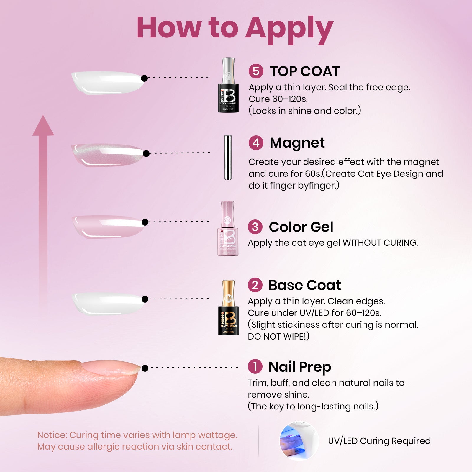 4. Finish with a top coat and cure for 60 seconds.Tips:*Please apply each coat in a thin layer.*The product is gel nail polish; it needs to be cured under a UV/LED lamp.