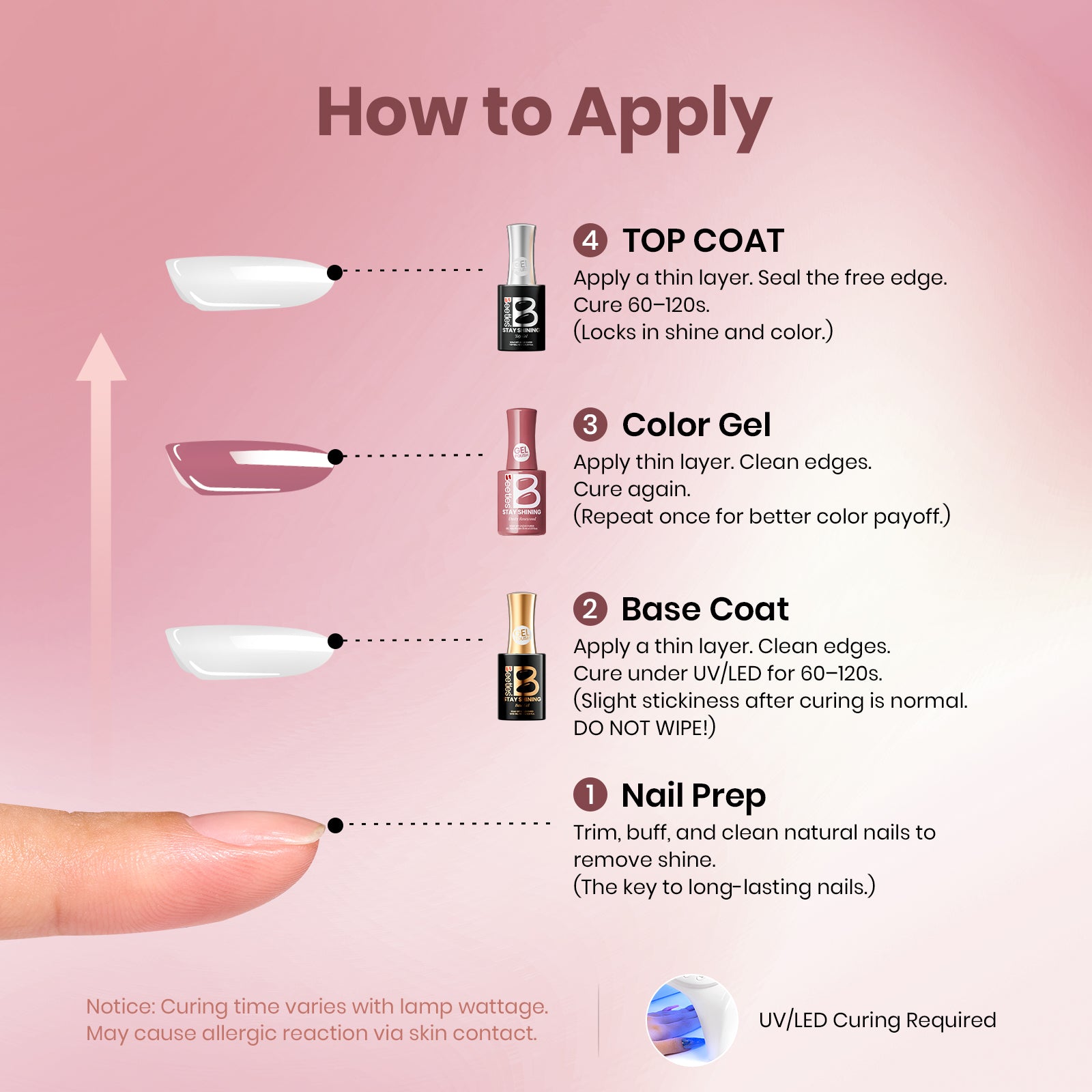 4. Finish with a top coat and cure for 60 seconds.Tips:*Please apply each coat in a thin layer.*The product is gel nail polish; it needs to be cured under a UV/LED lamp.