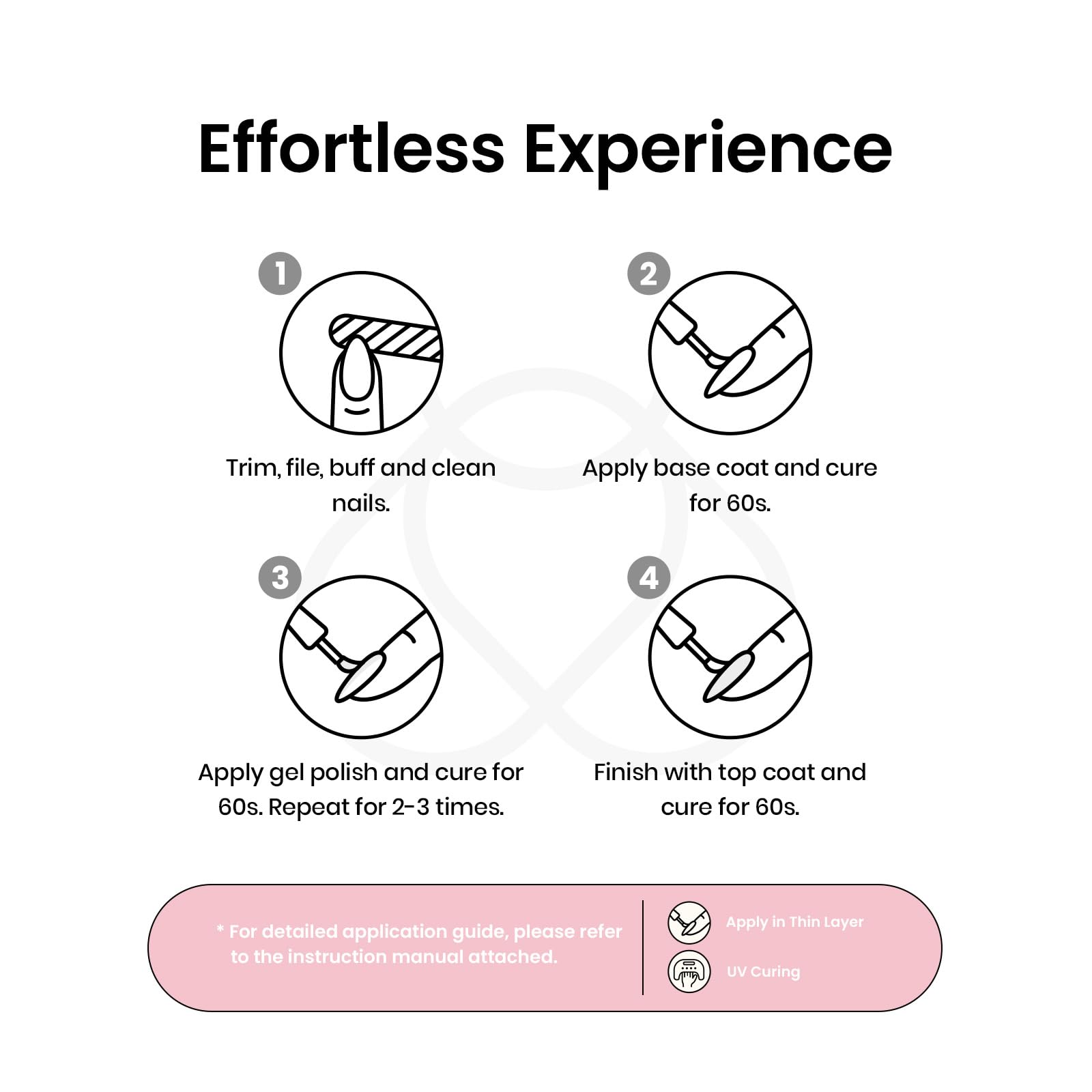 4. Finish with a top coat and cure for 60 seconds.Tips:*Please apply each coat in a thin layer.*The product is gel nail polish; it needs to be cured under a UV/LED lamp.